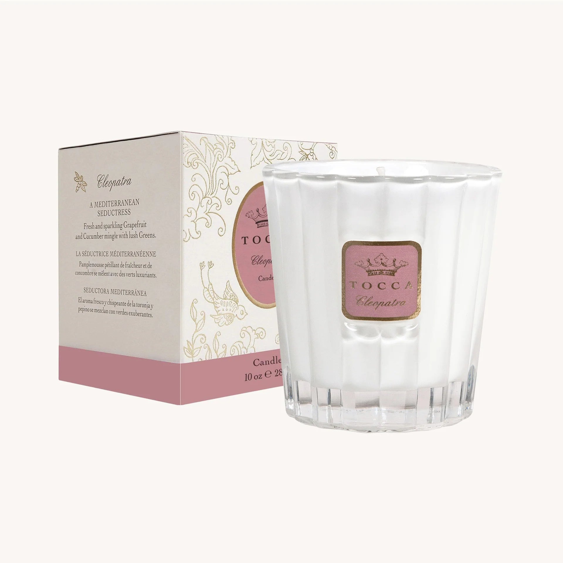 Cleopatra captures the hearts and minds of all who experience her refined power, with cooling cucumber and shimmering grapefruit. The fragrance is richly infused in a luxurious, proprietary soy-wax blend candle with a 100% cotton wick, hand poured into a fluted white glass keepsake jar.