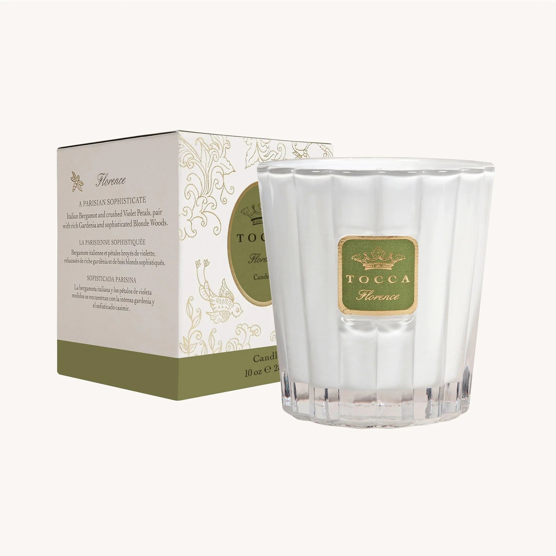 Florence is an undeniably charming floral with secret tangents into citrus, where joyful bergamot meets a fresh blush of gardenia. The fragrance is richly infused in a luxurious, proprietary soy-wax blend candle with a 100% cotton wick, hand poured into a fluted white glass keepsake jar.
