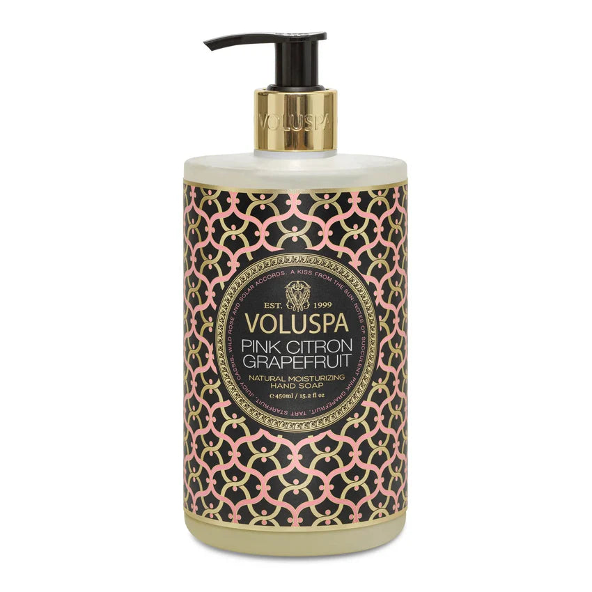 Voluspa’s Moisturizing Hand Soap is highly covetable with its elegant frosted soft-touch finished bottle, wrapped in classic black or white Maison artwork. Pops of distinctive secondary color highlights are coupled with accents of muted gold. An added touch of luxury is also present in the custom logo, embossed on chrome gold collars on all bottle necks. Each bottle is custom designed in-house and created with Post-Consumer Recycled material. The perfect balance of beauty and function, from our house to your home.
