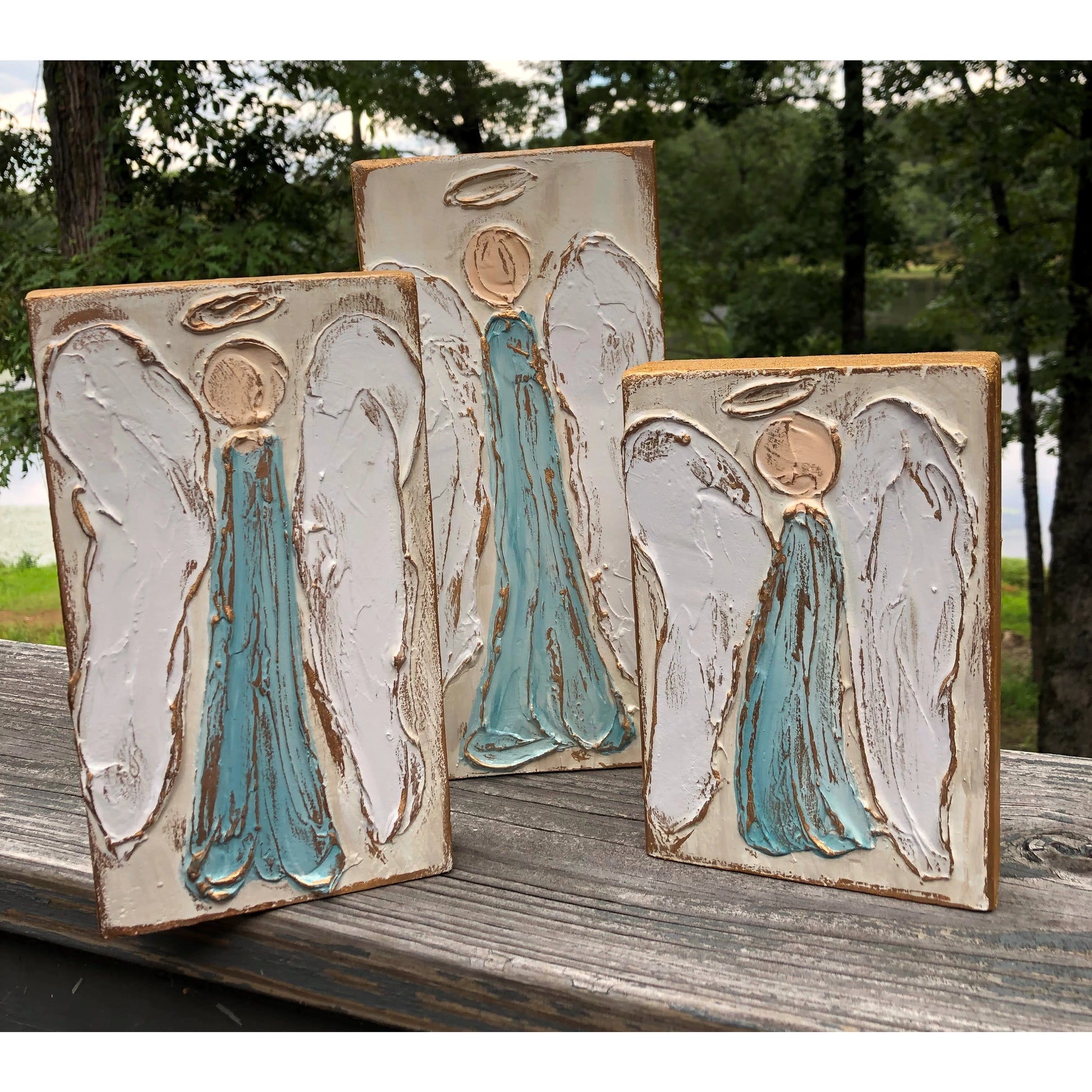 Beautiful handmade angels make a striking display for a mantle, table, or entry. Hand painted with texture & gold accents. Background is ivory with angel in a blue gown.