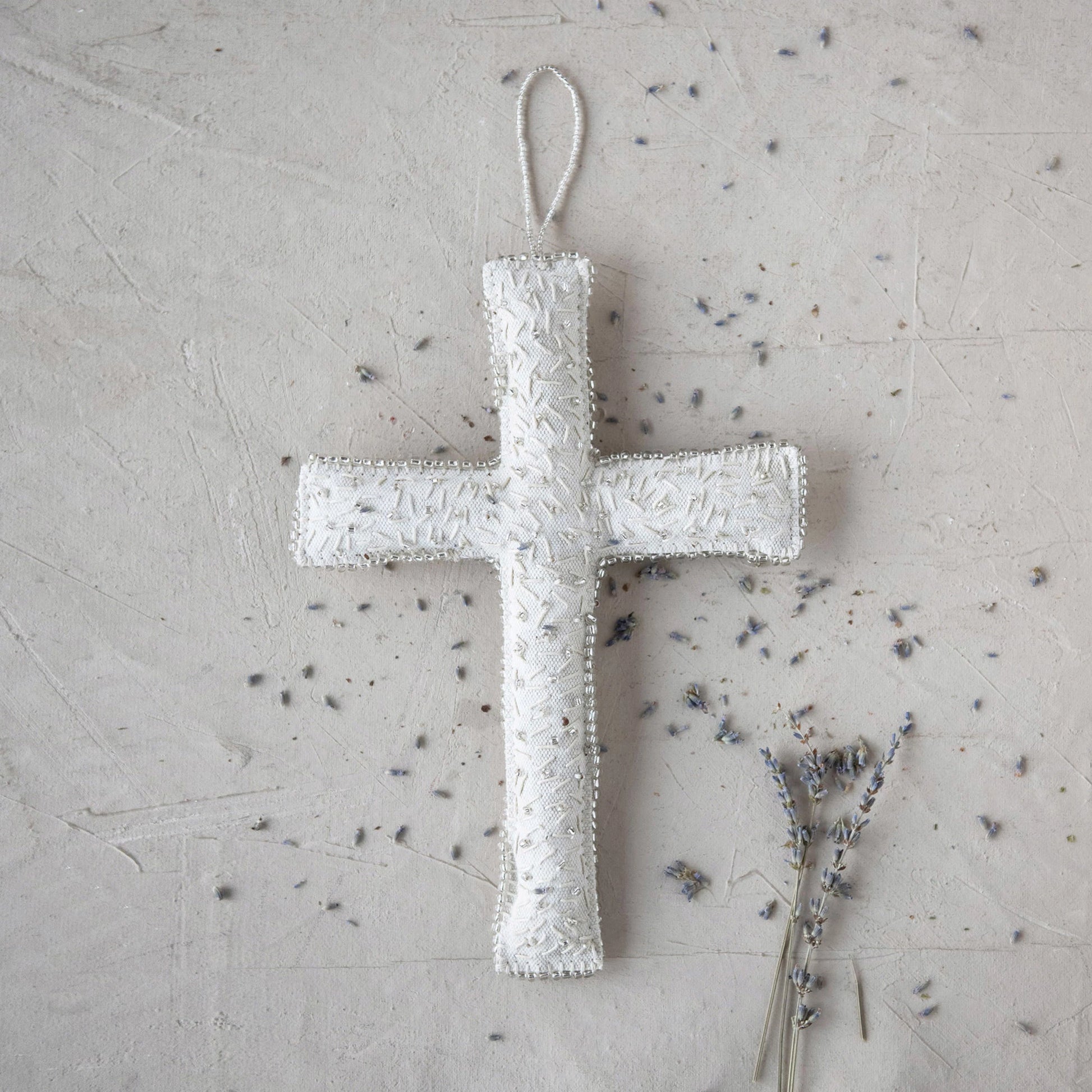 Approximately 6-3/4"L x 9-1/2"H Handmade Recycled Fabric Cross w/ Glass Beads, Cream Color