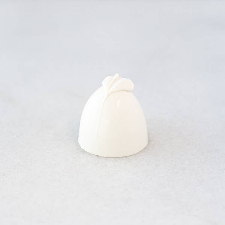 A dark chocolate cheesecake flavored ganache center, covered in a sweet white chocolate shell.