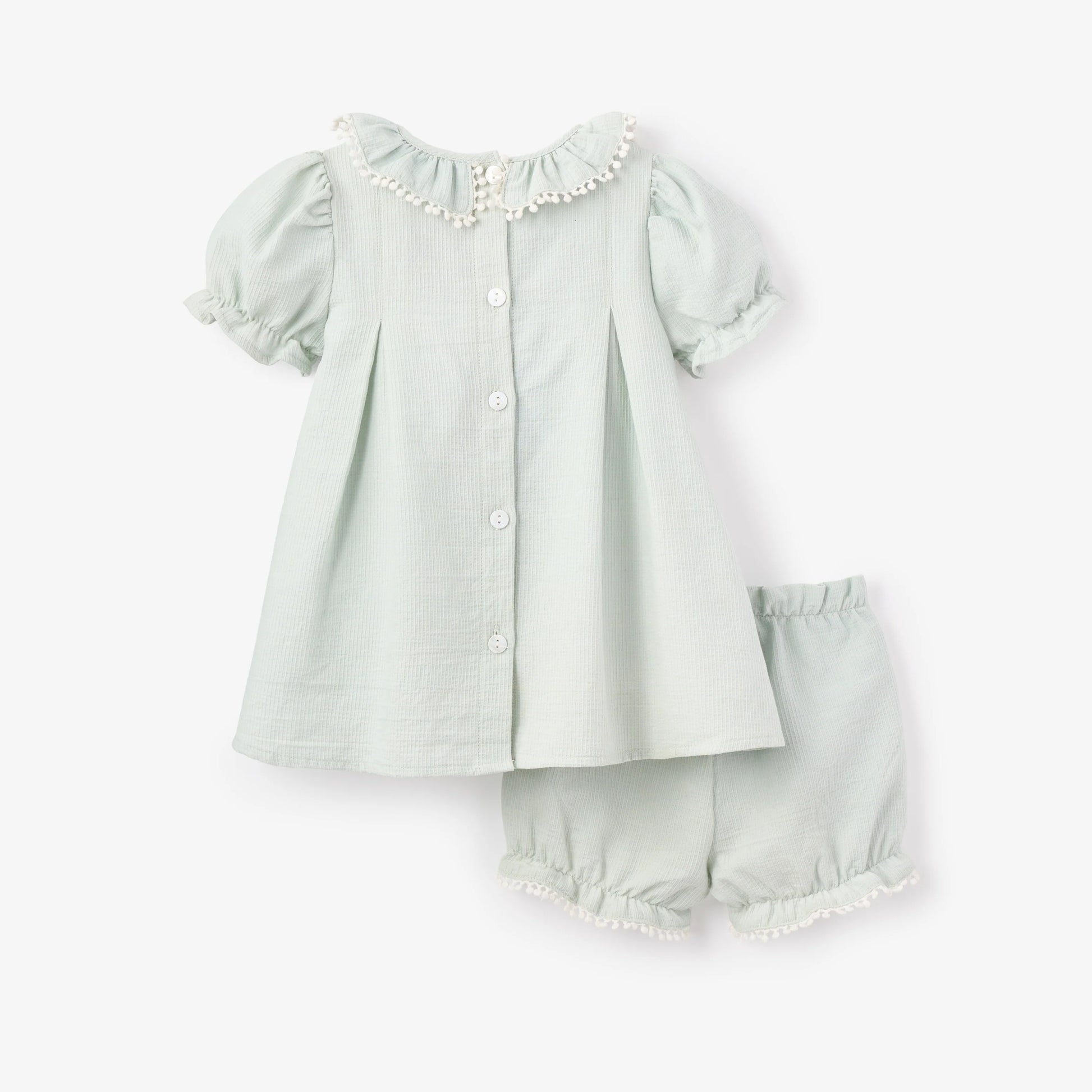 A charming nod to timeless spring style, this Bunny Embroidered Dress features a delicate ruffle neckline, puff sleeves, and a pleated A-line front. Crafted from light aqua flat weave cotton and paired with a matching bloomer, it's perfect for Easter celebrations and beyond.