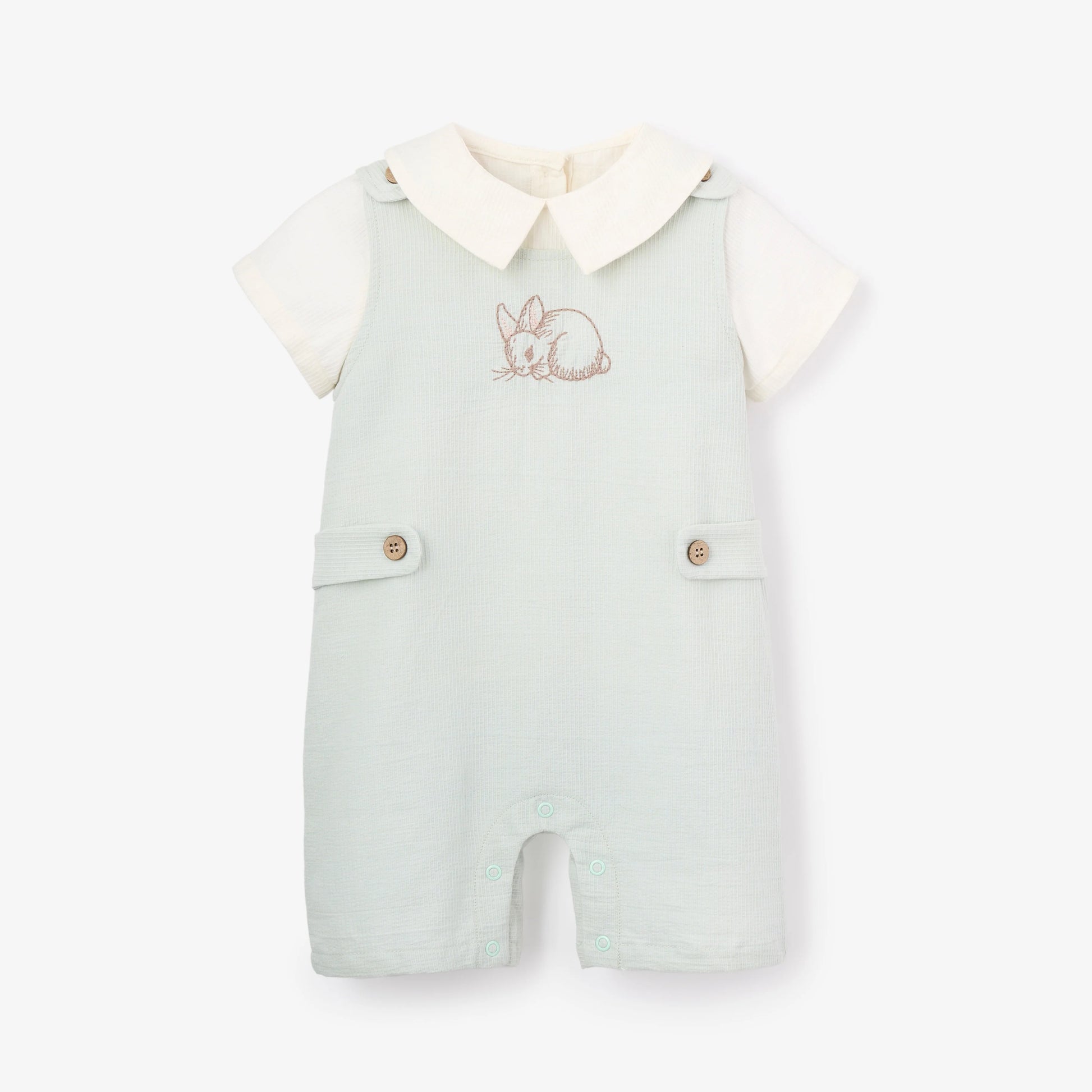 A timeless classic, this Bunny Embroidered Jon Jon with a crisp white collared shirt is perfect for Easter celebrations and beyond. With its heirloom-quality details and iconic silhouette, it's a cherished piece for special moments and family photos.