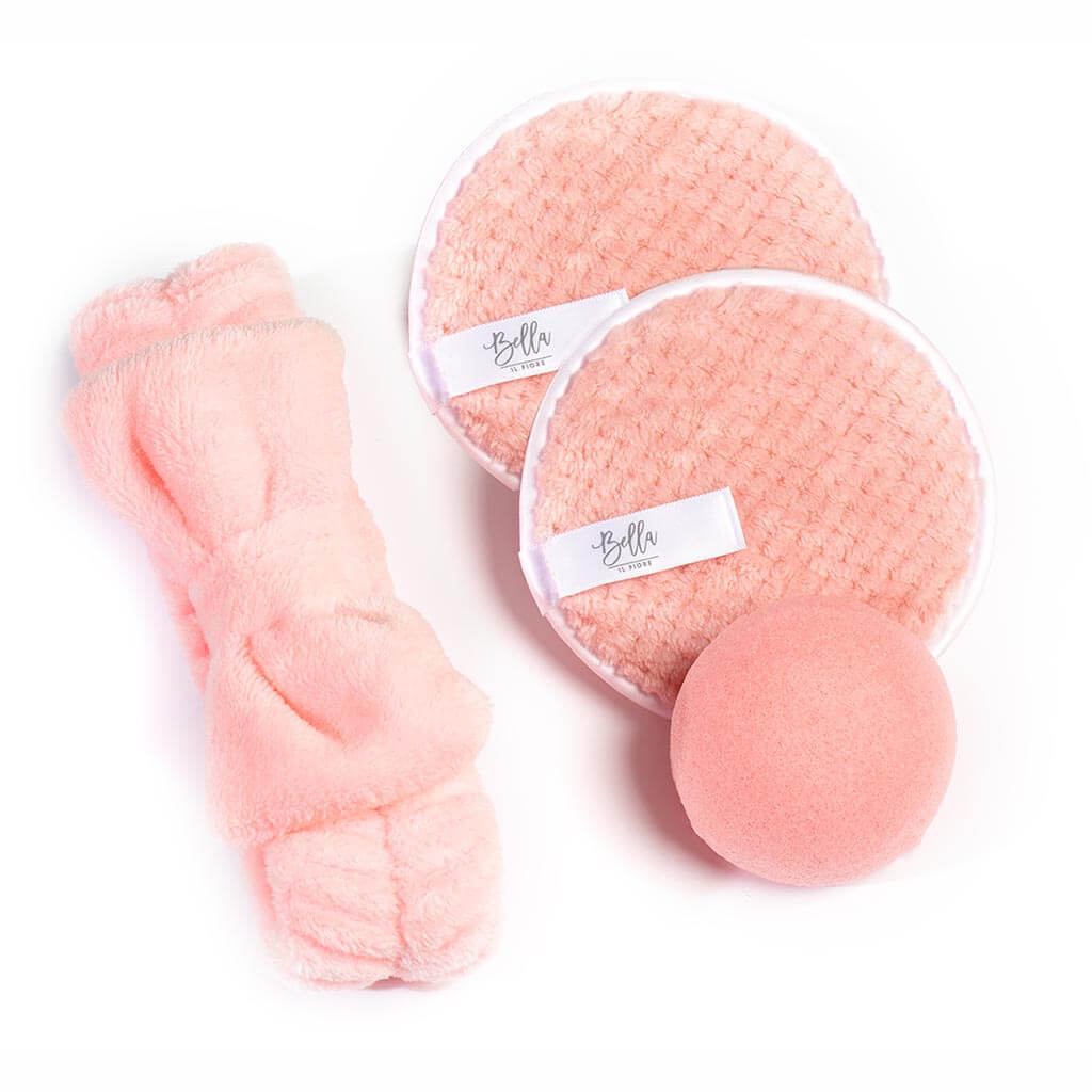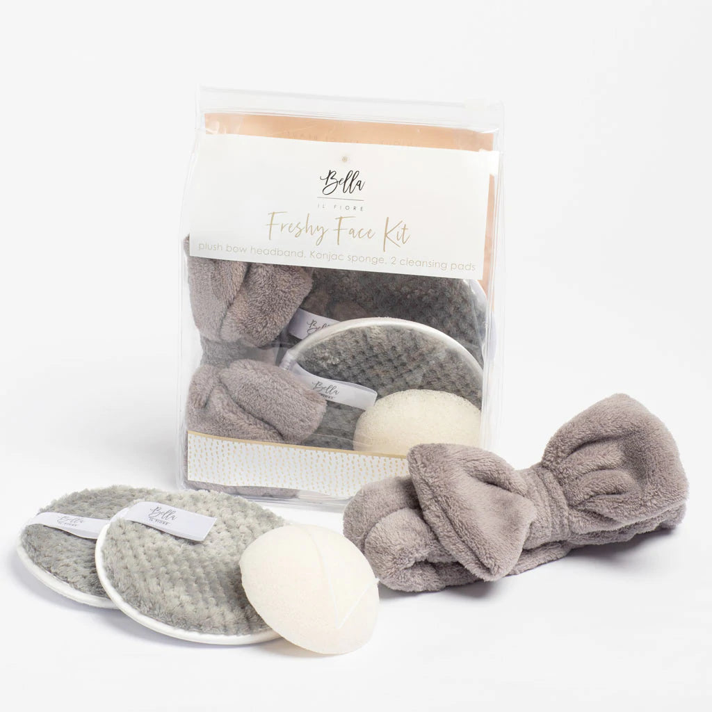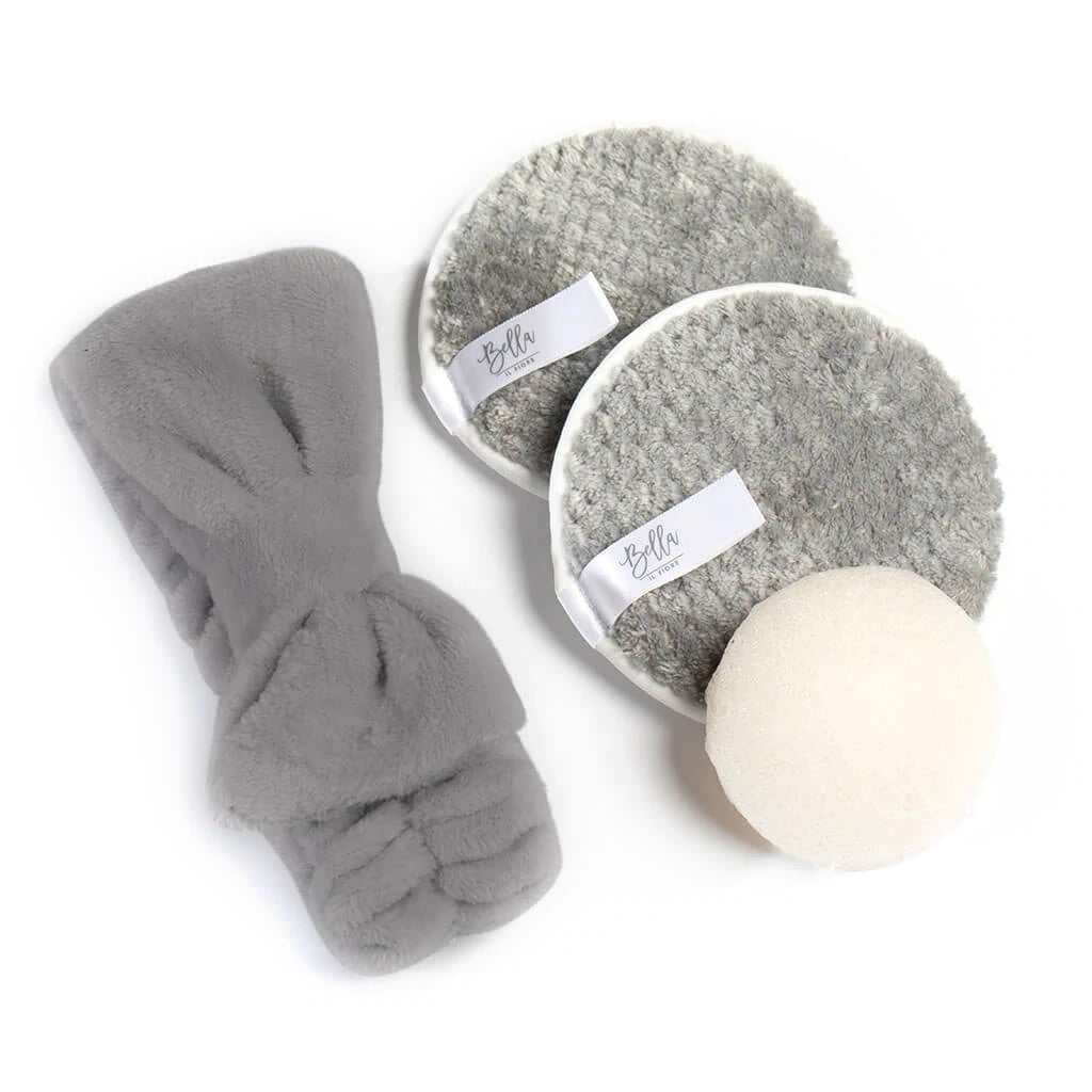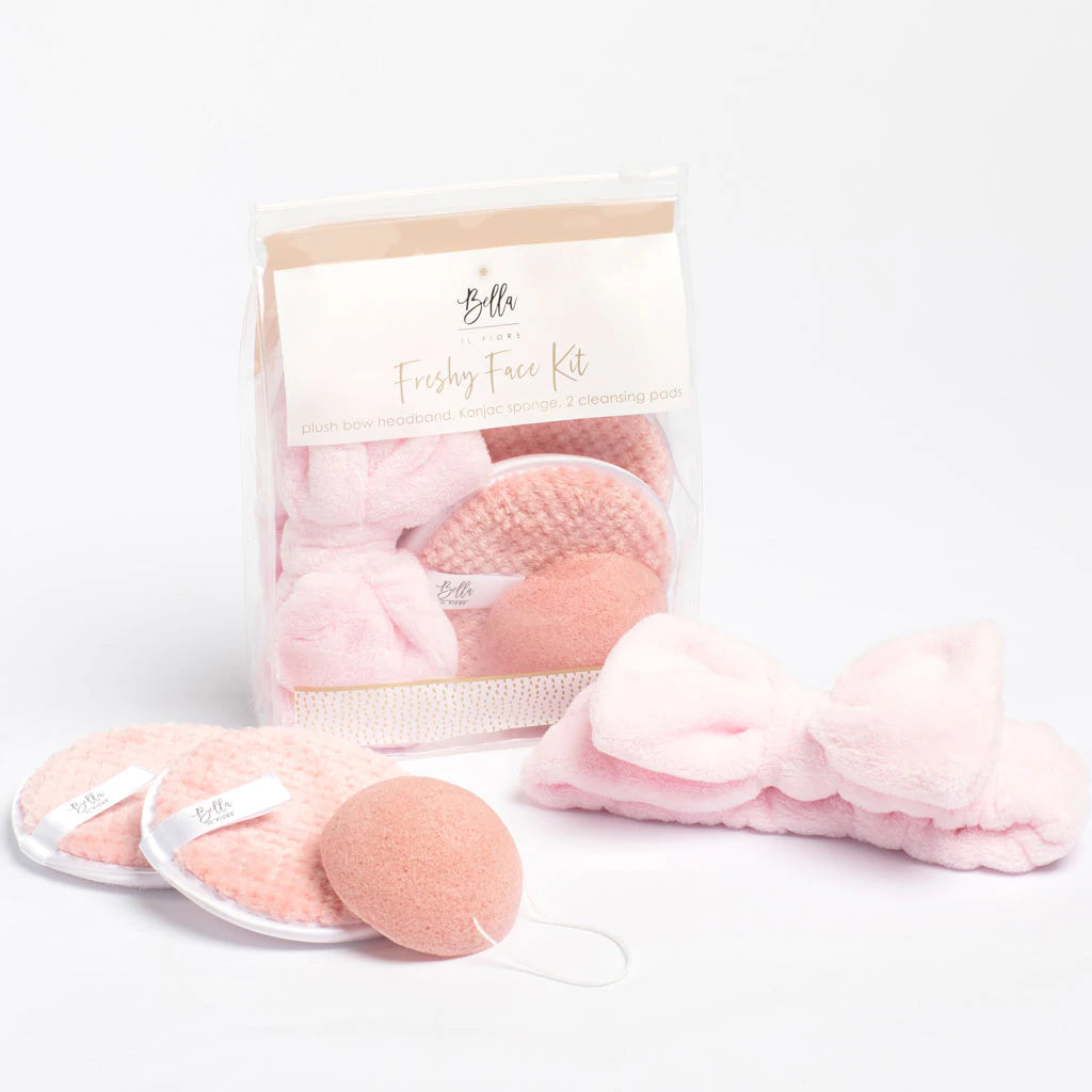 Say hello to a fresh face - kickstart your routine for healthy, glowing skin with this perfect combo face cleansing kit. Stylish spa headband with pretty plush bow keeps hair comfortably out of the way while you get gorgeous. Reusable face cleansing pads refresh your face by removing your make-up with gentle anti-bacterial microfibers and no harsh chemicals or scents. Luxurious konjac sponge cleans and gently exfoliates for a smooth, glowing complexion. Includes 1 plush bow spa headband, 2 cleansing pads + 1 konjac sponge.