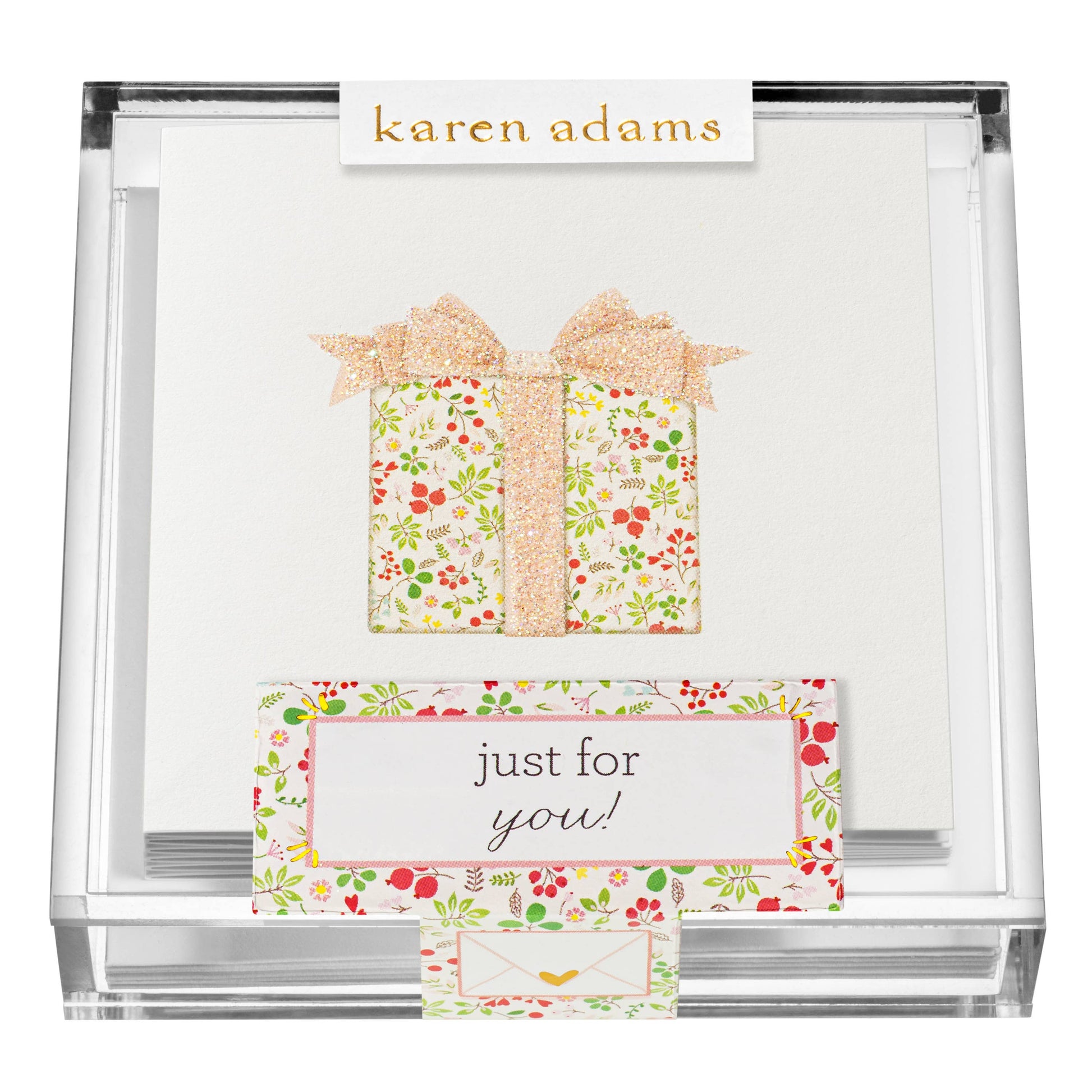 Send best wishes with this perfectly adorable box of hand-glittered cards featuring a gift.