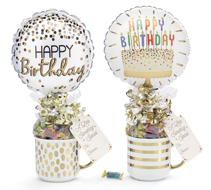 Included is a white/gold ceramic mug with Tootsie Rolls inside, decorated with a bow & cute Happy Birthday balloon!