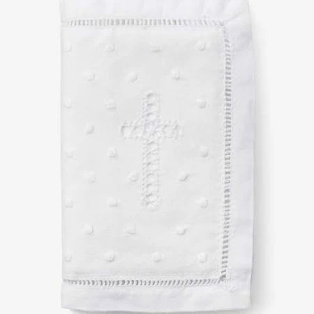 Bibles are one of the most cherished items in a person's home, always kept close on bedsides or dressers or bookshelves. This elegant Hand-embroidered Heirloom Bible Cover is particularly special because it is made to one day become part of a wedding bouquet when your little one grows to wed. A beautiful cross is stitched in the center of the cloth cover with a delicate lace trim.
