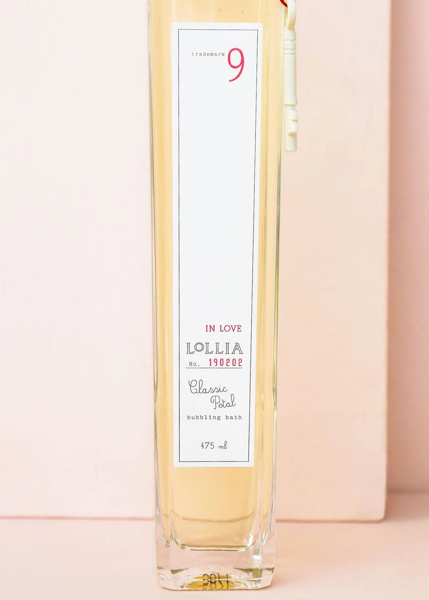 Strikingly romantic, this distinctive glass bottle of bubble bath is sweetly adorned with a symbolic key to the beloved's heart, accented with delicate red cording, and sealed with a signature Lollia cork.