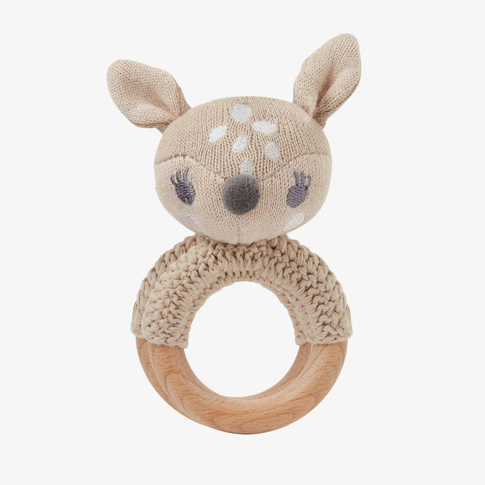 Perfect for small hands, our Knit Baby Rattle is made from 100% cotton with plenty of textures to stimulate baby's senses. The plush figure attaches to a wooden O-ring with matching knit detail. The baby rattle is not only adorable, but it is made to last!