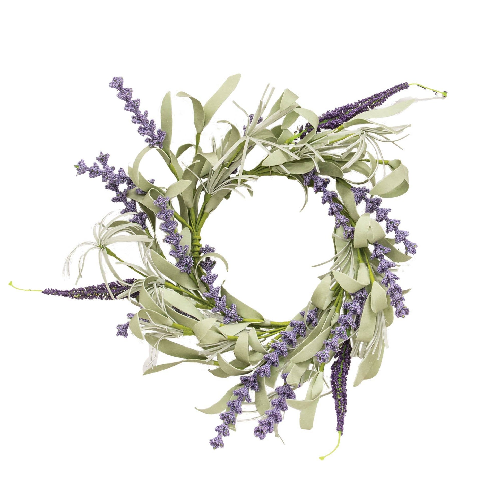Lavender Herb Candle Ring features foam leaves and plastic lavender buds on a green paper-wrapped base. Candle Ring has a purple and green color scheme and it looks great with flameless pillars and jar candles. Measures a 4.5" inside diameter and a 8-12" outside diameter.