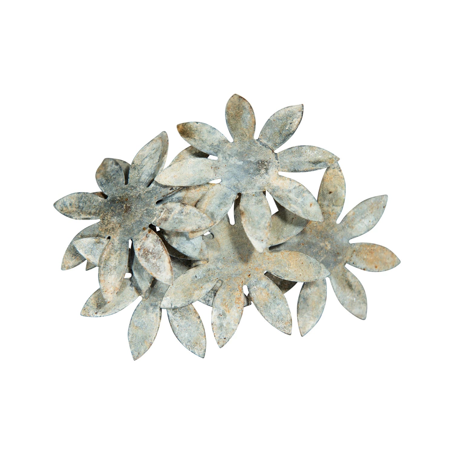 This distressed metal flower bunch has a variety of applications. It can be hung by the opening in the stem or laid flat on a table or in a decorative basket. For a centerpiece, place in a decorative vase with colorful sand holding the metal stem on the inside.