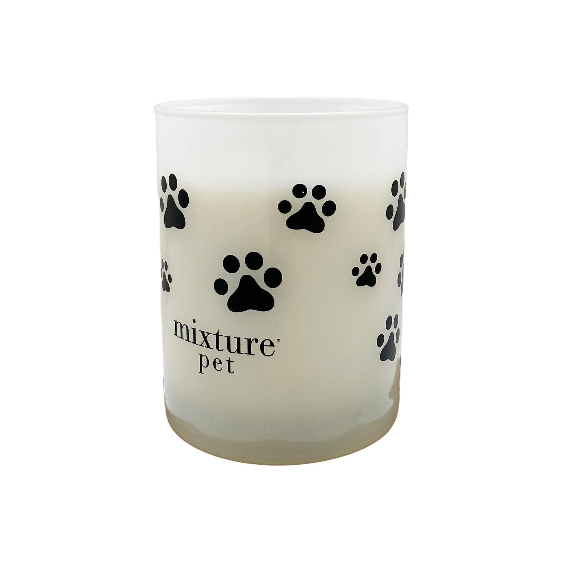 This 10oz soy candle is filled with natural soy wax and our Pet Lux fragrance, perfect for rooms where your pet may have left an odor. Mixture's Pet Lux fragrance is made with a pet calming complex derived from valerian root extract. This candle has an approximate burn time of 75 hours and comes in a decorative glass container featuring black paw prints.