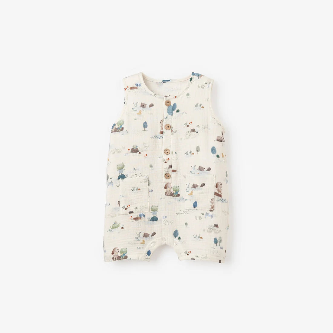 Good for baby, good for the environment. Our organic, naturally sustainable muslin is soft and breathable, ideal for outdoor adventures during the spring and summertime. Cast in a dreamy palette, this muslin shortall baby romper combines fashion and function for the modern child. Wooden buttons and a henley collar add an extra dash of style to this already stunning organic baby romper.