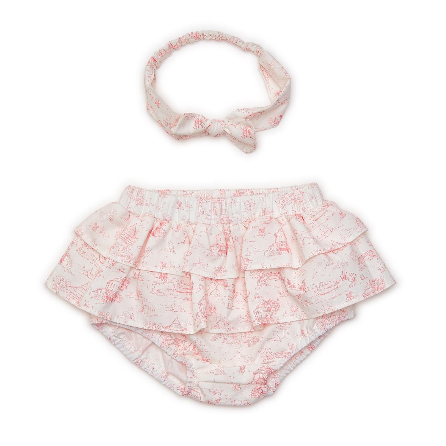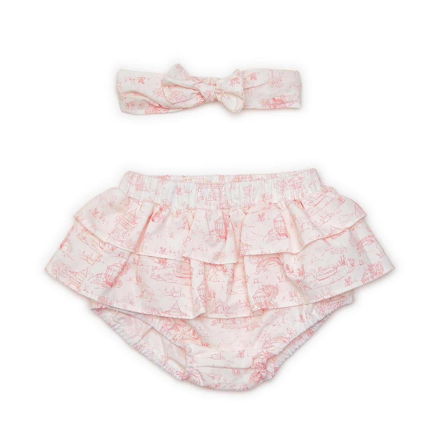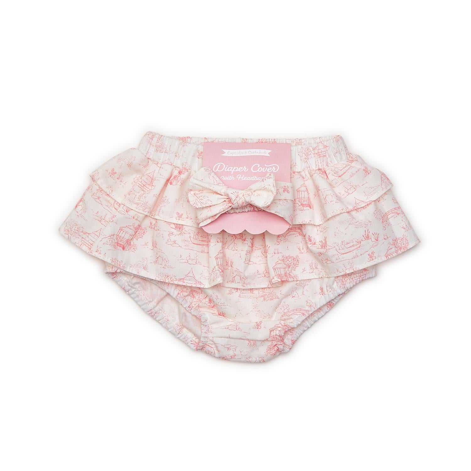 Dress your little one in sweet and adorable style with our Animal Toile Ruffled Cotton Diaper Cover and Headband Set. The comfort, adorable ruffled design, delicate baby animals toile print, matching headband, and versatility make it a must-have for any baby girl's wardrobe.