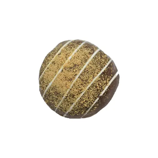 This ganache center consists of milk chocolate, mini marshmallows and graham crackers, then it's coated in milk chocolate, topped with white stripes & crushed graham crackers. No campfire needed!