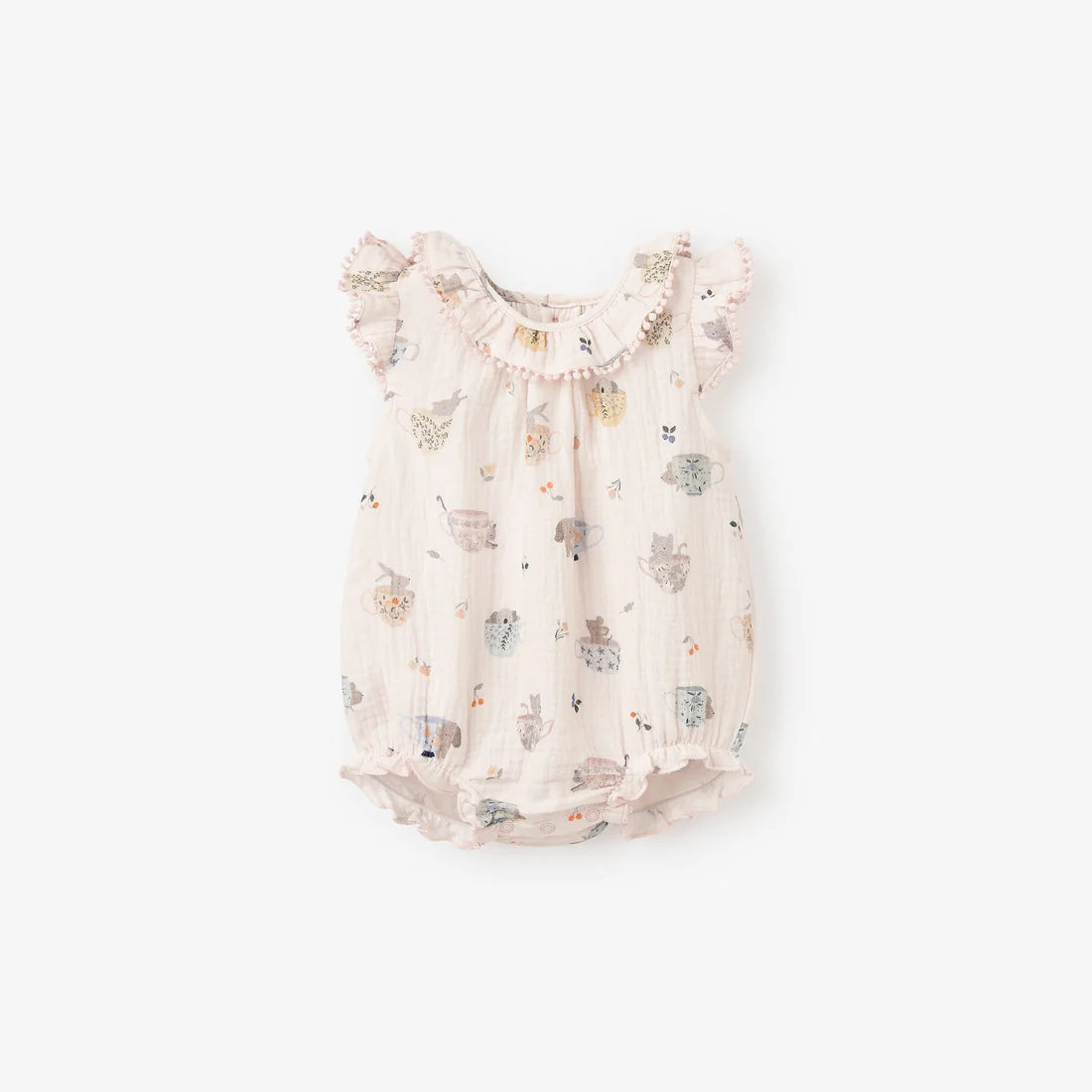 Good for baby, good for environment. Our organic, naturally sustainable muslin is soft and breathable, ideal for outdoor adventures during the warmer months. Created in a whimsical tea party print, this muslin bubble romper looks adorable and wears beautifully.
