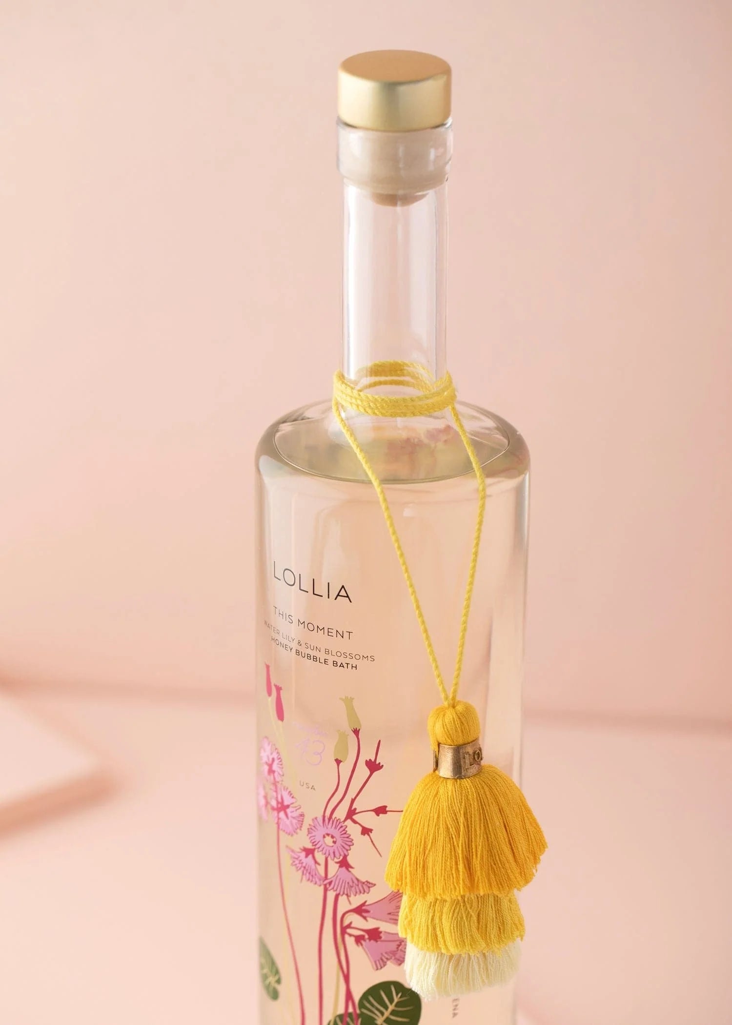 A lovely tub-side addition, this slender glass bottle plays up tall, graceful blossoms. Finished with a tiered tassel – elegantly modern & sunny – it’s sealed with a signature Lollia cork accented in gold.