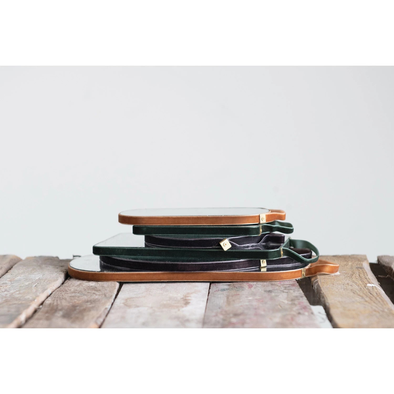 Rectangles, ovals and circles are represented in this collection of decorative mirrors. Each frameless mirror has a different color velvet covering its outside edge. They will be a wonderful addition to any room decor and can be placed together as a collage or spread apart on different walls throughout the room.