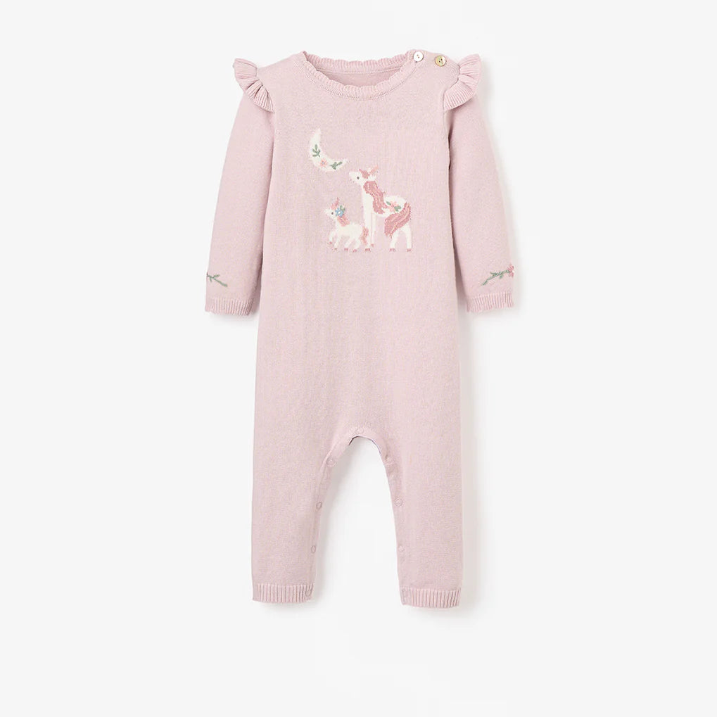 We have the perfect outfit for your precious little girl! This soft, mid-weight, cotton knit baby jumpsuit will keep baby warm while looking photo-ready. The whimsical unicorn design pairs perfectly with our blankets to make a beautiful baby gift set.
