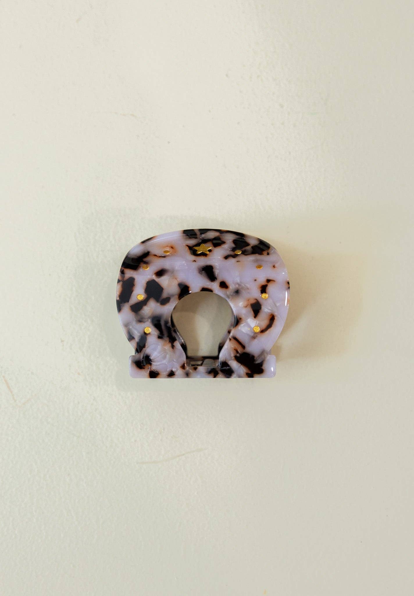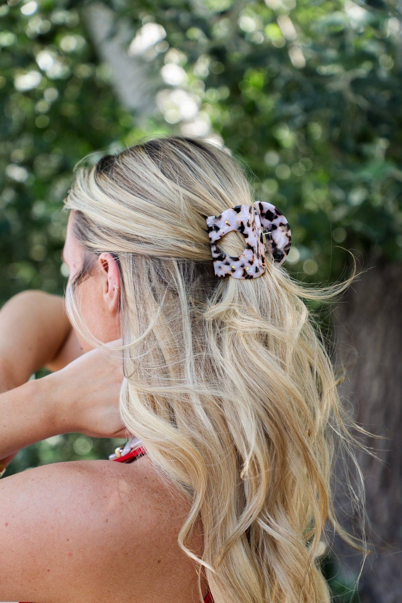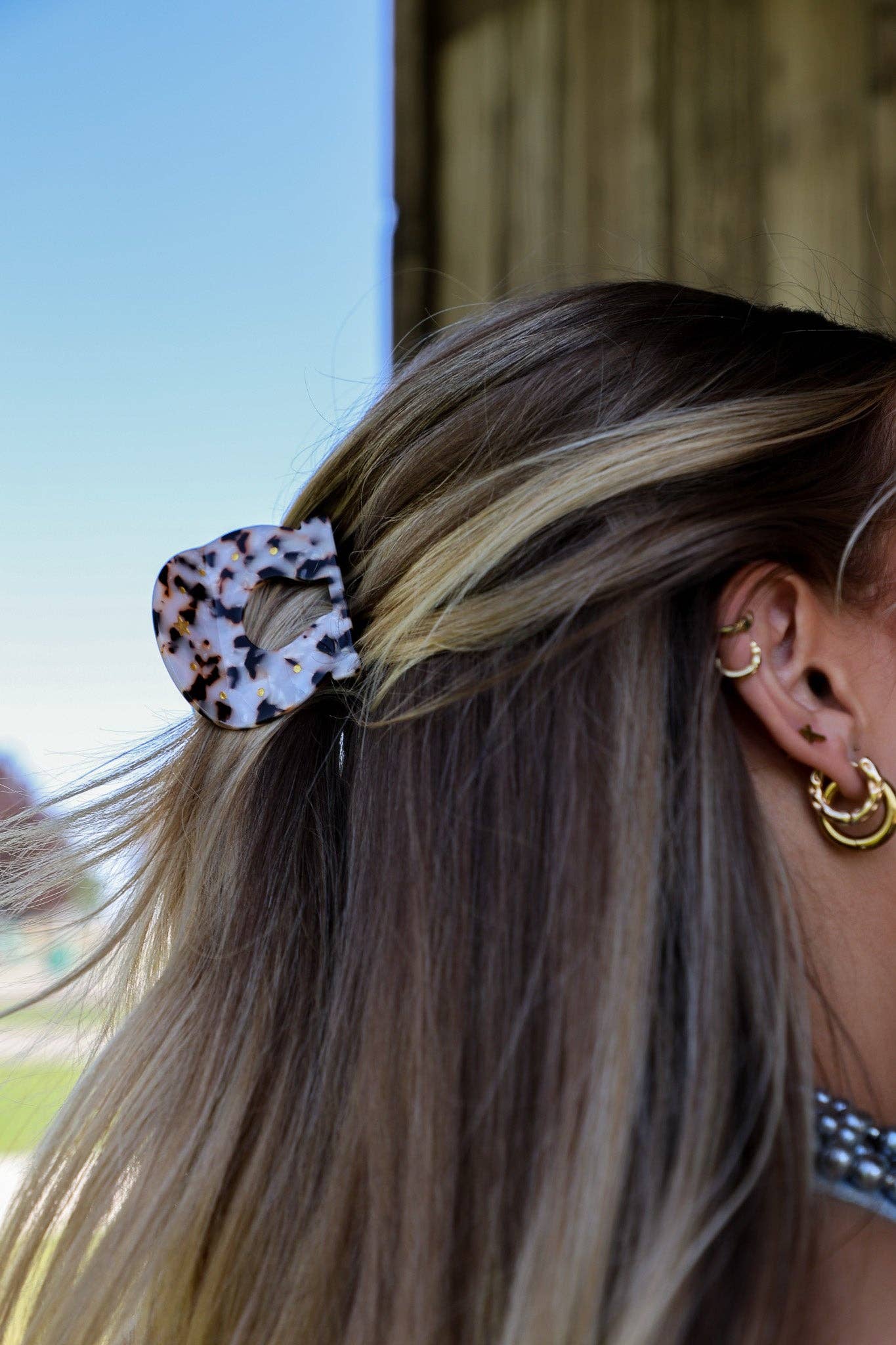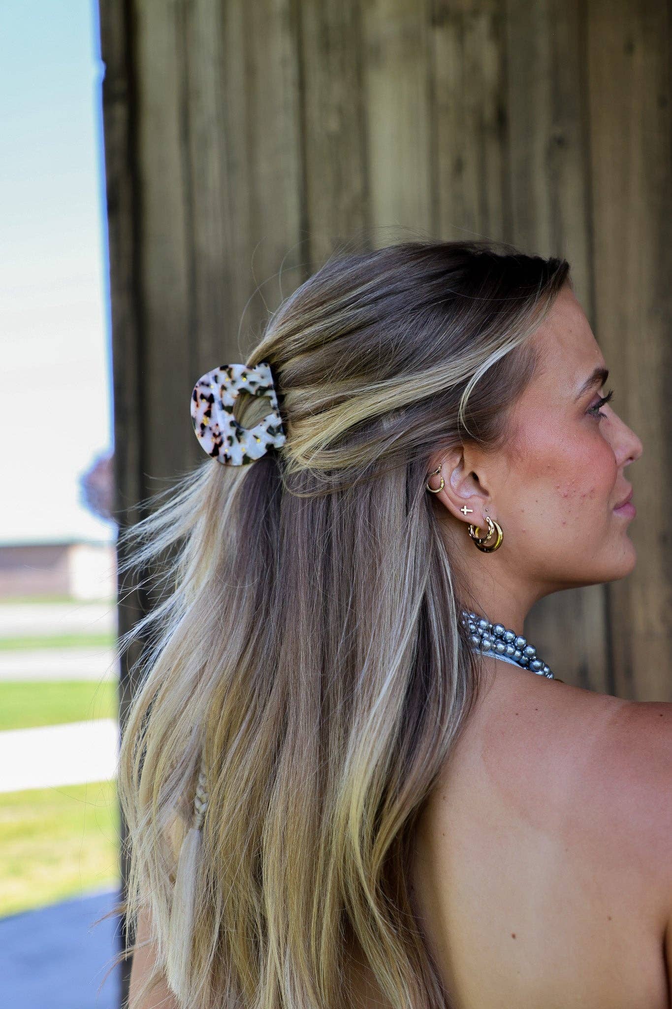 our horseshoe hair claw is here to wrangle all your strands in style. crafted from premium black and white cow print acetate, this little western-inspired clip adds just the right touch of yeehaw to your everyday look.